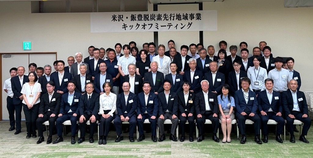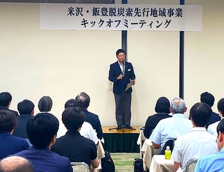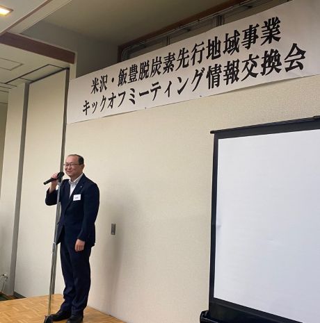 ニュースリリース 米沢・飯豊脱炭素先行地域事業キックオフミーティングを開催! 2025.08.23 2025年(令和7年)7月18日、飯豊町の神乃湯ホテルで脱炭素先行地域の共同提案者が一同に会する「脱炭素先行地域事業キックオフミーティング」を開催いたしました。 共同提案者として名を連ねた25の企業・団体などから70名が出席しました。 米沢市長の近藤洋介氏、飯豊町長の嵐正人氏、山形県環境エネルギー部長の沖本佳祐氏が、脱炭素先行地域事業に向けての豊富と重要性を述べました。 環境省東北地方環境事務所所長の中島尚子氏が来賓としてこのプロジェクトへの期待を述べられした。 約1時間渡り、参加企業・団体毎の紹介た後、米沢市と飯豊町の事務局からプロジェクトと各事業、スケジュールが説明されました。 国からは5年間で最大50億円(特定地域脱炭素移行加速化(GX)交付金と組み合わせると最大60億円)、原則3分の2が交付され、交付金を通じて国の支援を受けながら、2030年カーボンニュートラルを目指し、先進的(20年早いゴール)取組みとして置賜地域全体への横展開も期待されています。 今回のキックオフミーティングは共同提案者が一堂に集まったのは初めてだけに、会場ではそれぞれの名刺交換や事業に対しる意気込みなどを語り合っていました。 おきたま新電力にとってもこの事業に関わる役割は小さくないだけに、あらゆる立場で関わていくようにしていきます。 皆様のご支援をお願いいたします。 この模様は 米沢日報デジタルで詳細が紹介されております。 https://www.yonezawa-np.jp/html/newsmovie/2025_2H/20250720mov1.html Post